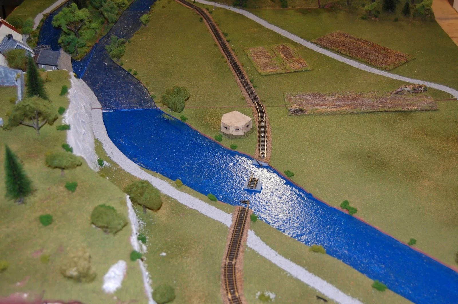 Positioned on the heights overlooking the Meuse, is one platoon (scaled from Company) of the II/39/5eDIM. Two other platoons are stationed off board to the west as the French didn't place their troops near the river but instead took the high ground located to the west! Hevey MG team and artillery FO are seen at center. But the morning began with fog and the French didn't see the Germans below!