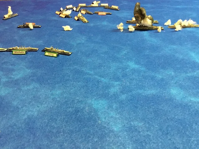 The German Vanguard, the CL and TB to the left and the BC Lutzow, followed by her sisters, on the right with the CL Ebling and some TB investigating some smoke at extreme sighting range