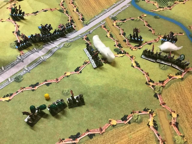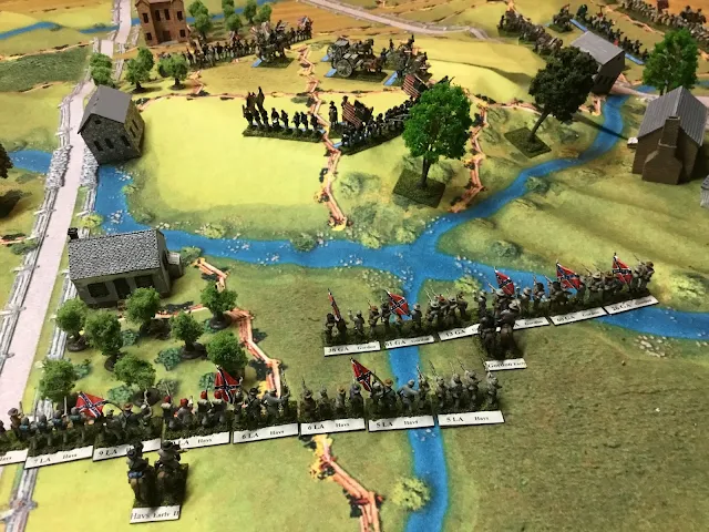 One of Kyznowski's regiments (top left center) rolls snake eyes on a morale check (instant rout in the rules), leaving his defensive line a tad shaky. Ironically, his men routed one of the Rebs' units who rolled the exact same result! General Avery's Brigade is outflanking the Federals anyway on their right (right center)