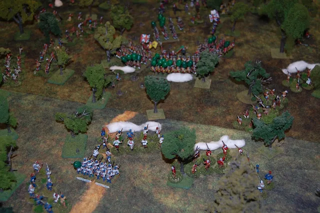 Along the English left flank, numerous Native bands are preparing to slaughter more Englishmen, inc the last Virginian Flankers (top right)...