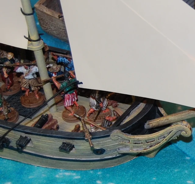 With the Englishman moving away again (onto a second table...and I forgot to bring two sea-mats! The joke became the sea was turning grey because of an oncoming storm!), the Frenchman fires a volley, and scores two hits! The Englishman takes some damage to his rigging, not enough to slow him down, yet...Sailing into the wind (and making several successful tacts through the wind), and leaving the French Sloop (top) behind temporarily, the Englishman (right) is now forced to engage the arriving Dutchman (left), but again misses...Just when it appears that the Englishman might pull away, the Dutch Captain takes a gamble of his own, steering into the wind. He makes his Advance Sailing test, and successfully grapples with the English Sloop!The English Captain doesn't wait for the Dutch however and leads a small band of his own Sea Dogs which succeeds in downing a Dutch Zeelieden...-