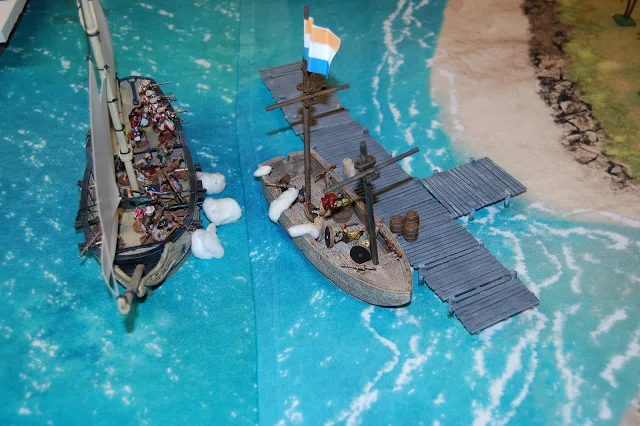 As part of our continuing 17th Century Adventure, my personal character, Don Antonio, has had success. Earlier we had a game where a French Fluyt was captured and significant booty was taken. With that (in our game mechanics) Don Antonio purchased an upgrade, a Sloop armed with 4 6lb and 2 9 lb guns. He also hired on some new men in Cartagena where they had come ashore for resupply. He then continued on his patrol eastward towards eventually Trinidad. That was the easternmost island colony of the Spanish at the time. Towards the end of that particular week (our campaign turns are in weekly portions), he decided to pay a visit to a known Dutch smuggling settlement that was claimed by the Spanish, but not settled and controlled by Spain until the next century.