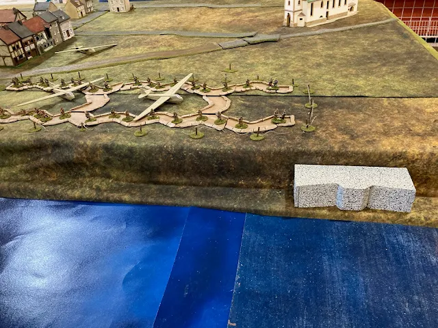 The key bunkers to the Belgian defenses, one alongside the highway; the other directly beneath the bridge. The demolition charges would be set off from these and were obviously, the prime targets of the German Fallschirmjager. Historically the orders never arrived to set off the charges (Belgians waiting for orders), as the HQ Bunker where the commander was preparing to phone in his orders, was completely destroyed by Stuka attacks for that purpose!Two identical, large Casemates guarded the Canal, located south and north on the canal from the bridge. Neither would play much of a role historically or in the game...Closeup of German Gliders, #1 whose nine men were to attack the bridge bunker to cut the demo charges as well as the two closest Belgian houses (thought to house soldiers)...A view across the northern part of the field...An example of how effective the German assault was. After only 30 minutes, the Fallschirmjager have rendered both bunkers inoperative; destroyed one of the two targeted houses, and have virtually cleared the southern and western trenches! Fighting was still going on in the northern trenches as German Me109 and Stukas begin their runs! Our rules had to reflect that Belgian rifles and MGs had a bad habit of malfunctioning! And thats not to mention none of their grenades had their detonator caps installed!In the southern/western trenches the Germans are consolidating their defenses while expecting counterattacks...As our game wound down after 90 minutes of fighting, we sped up the timeline (we had to break for dinner), so as to launch the major Belgian counterattack, supported by three T13 tanks. The Germans struck with Stukas, but they succeeded in disabling one...