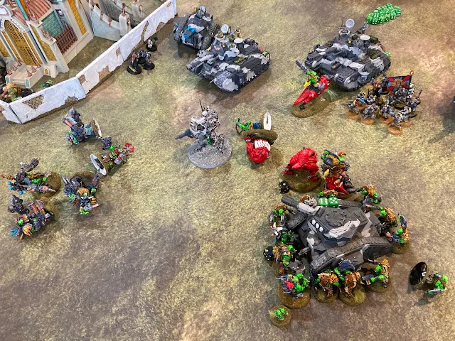 A Krieg Squad and a Ogryn detachment, unload from their Chiimeras which have taken hits. To the left is a Plasma Cannon LemanRuss..One of the Battlewagons has taken heavy hits already from the Imperial Armor and one of the SquigBoyz is down as well...On the Ork right Flank, more Krieg and Ogryns have unloaded, while here too, the Battlewagon has taken numerous hits...Even the Gorkanaut has been hit. Unfortunately it moved beyond the assistance of its Mek (seen to the lower left)...The Grots and their tanks charge into the Krieg and Ogryns and take down some. The Chimera take some hits as well. But they are then annihilated in return...The Grot Mega Tank charges into the LemanRus but all of its damage (9 pts) are self-inflicted by overloading Plasma!The Battlewagon with the Greenskins left flanks charges and nearly wipes out three Ogryns; but it too pays the price as Imperial tanks brew it up...The SquigBoyz are pushing on, preparing for their charge...The battlefield at the end of two rounds, with Imperial Armor reinforcements at far left (inc LemanRuss tanks lower left, and RogalDorn tanks top left). Ork Stompa has arrived (top right) as well as a Super-Stompa and MegaDread (lower right). Note a Deff Dread has been lost by the Orks at bottom...The Mega Dread has some serious damage as well! The LemanRuss tanks can sting...