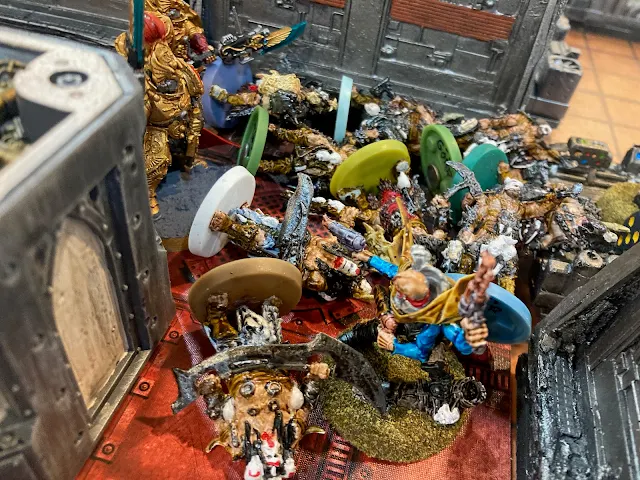 A second group is likewise despatched by the Custodes...The cultists are dropping like flies...Losing yet more, the cultists finally bring down a Custodes (c)...Two inhuman mutants take down two Custodes!One more Custodes trades his life in order to destroy numerous cultists...One lone Custodes attempts to hold back the forces of evil...None shall pass this hatchway...Yet, two more Custodes sell their lives dearly...Overview of the battlefield with all of the fighting having taken place at the central hallway. The cultist leadership is seen at bottom..The Custodes counterattack begins as three members teleport behind the cultists (c-r)...The fighting continues in the central hallway...A cultist Kelermoph moves to engage his enemies...The Custodes pushing out from the Central Hallway...After taking down one and badly wounding another, the Kelermoph himself is despatched. (bottom l)..